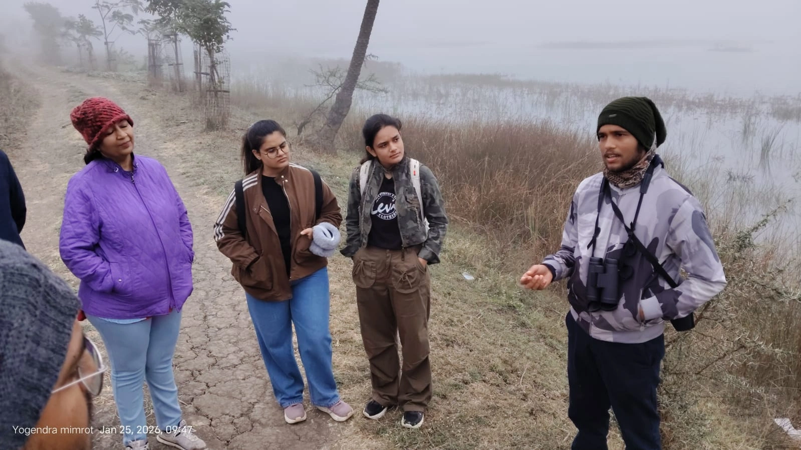 A bird walk was conducted at Daulat Baroda Lake, led by Yogendra Kumar Mimrot in collaboration with MP Tourism, with 11 participants. The morning was marked by dense fog caused by a western disturbance across the city, which significantly reduced visibility and made birding a bit challenging. Despite this, the group remained engaged and patient, using the conditions as an opportunity to focus on calls, movement, and habitat cues while learning about wetland and grassland ecosystems.