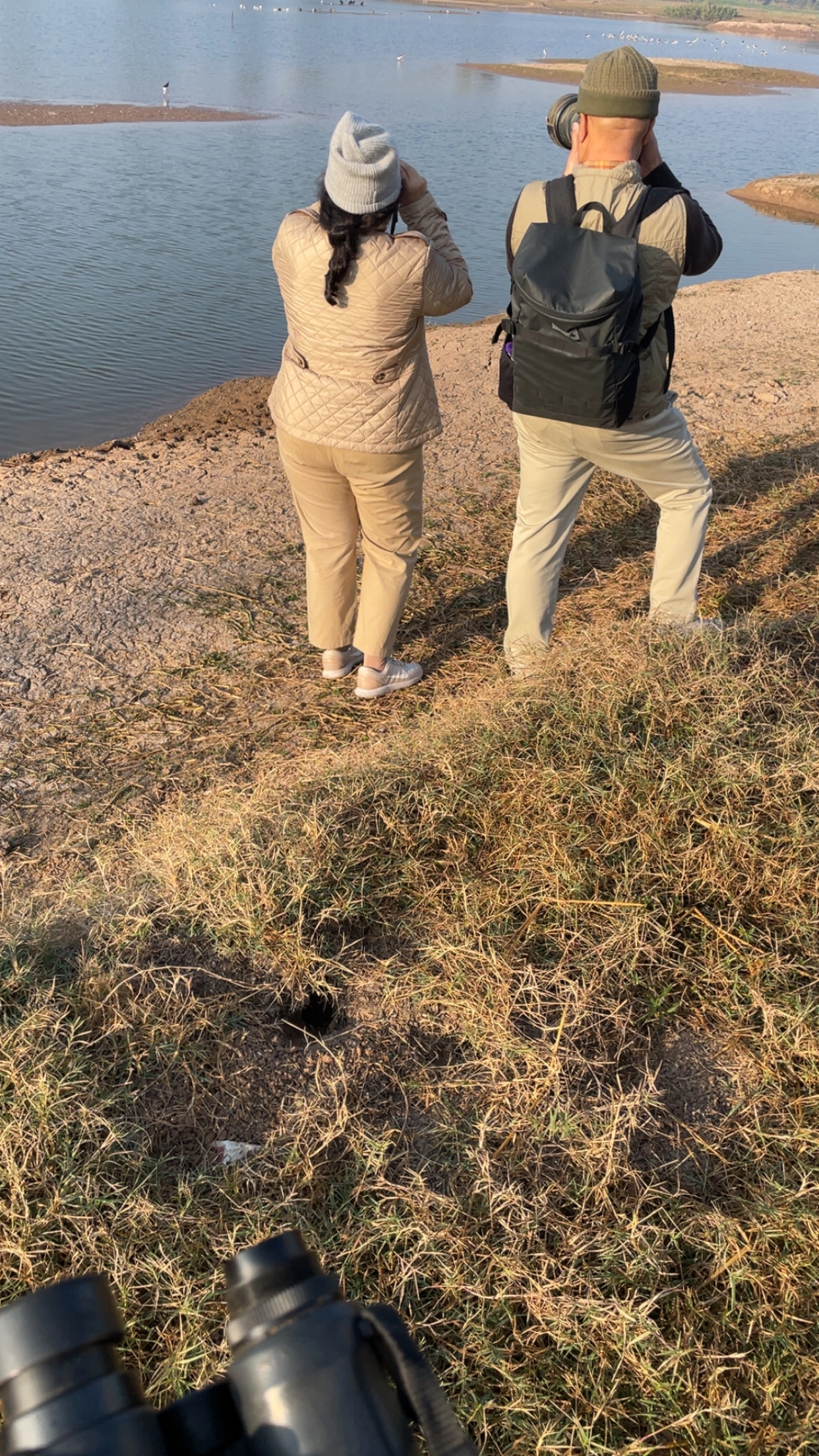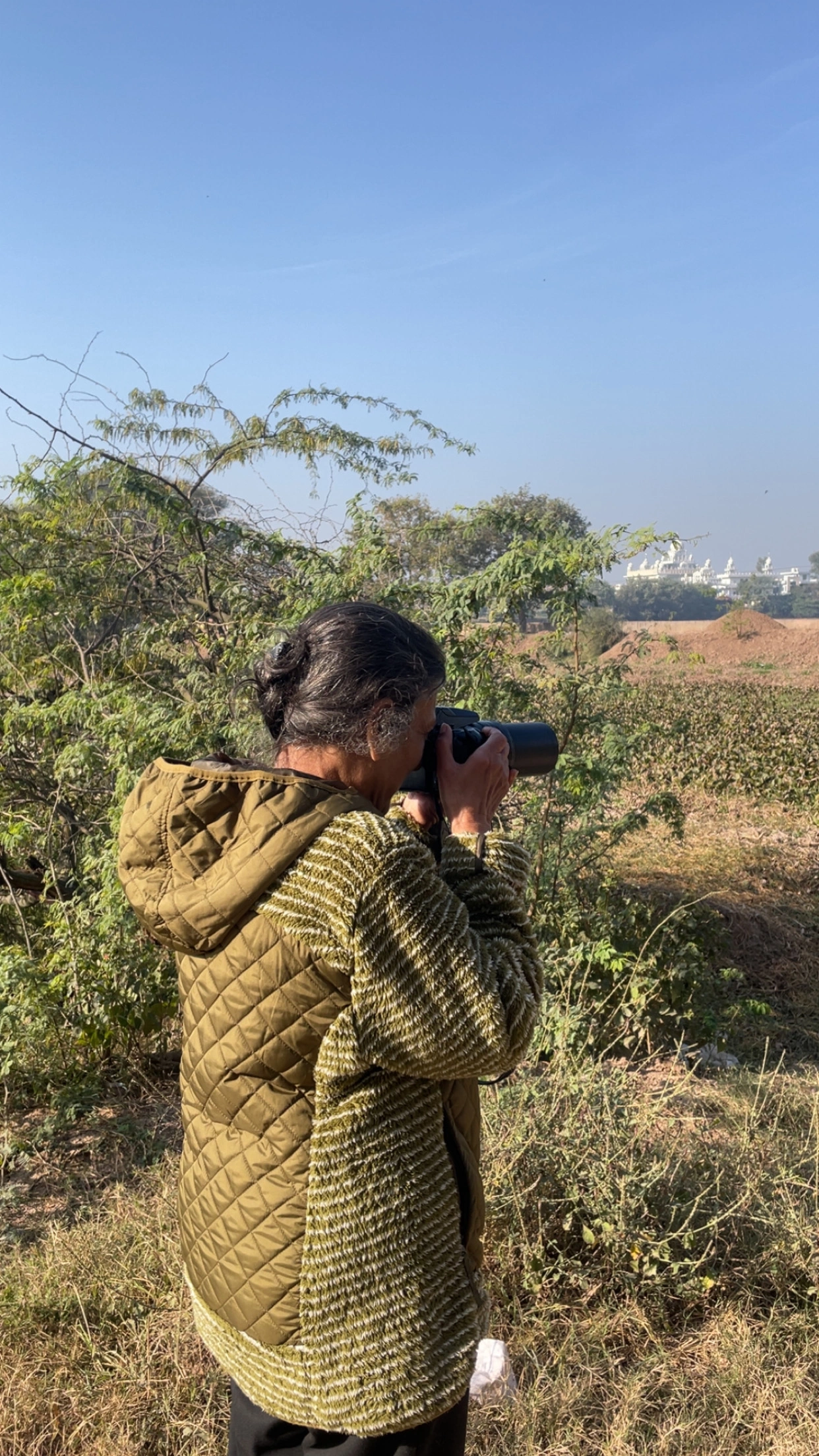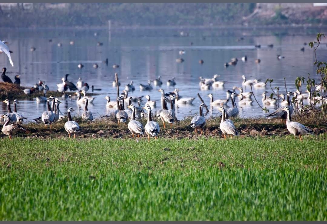 The surrounding agricultural fields and shrub-lined bunds offer foraging space for White-throated Kingfishers, Black Drongos, Indian Rollers, Red-naped Ibises, Pied Bushchats, and Siberian Stonechats, while the scattered groves and roadside trees support resident woodland birds such as Coppersmith Barbets, Spotted Doves, Laughing Doves, and Green Bee-eaters