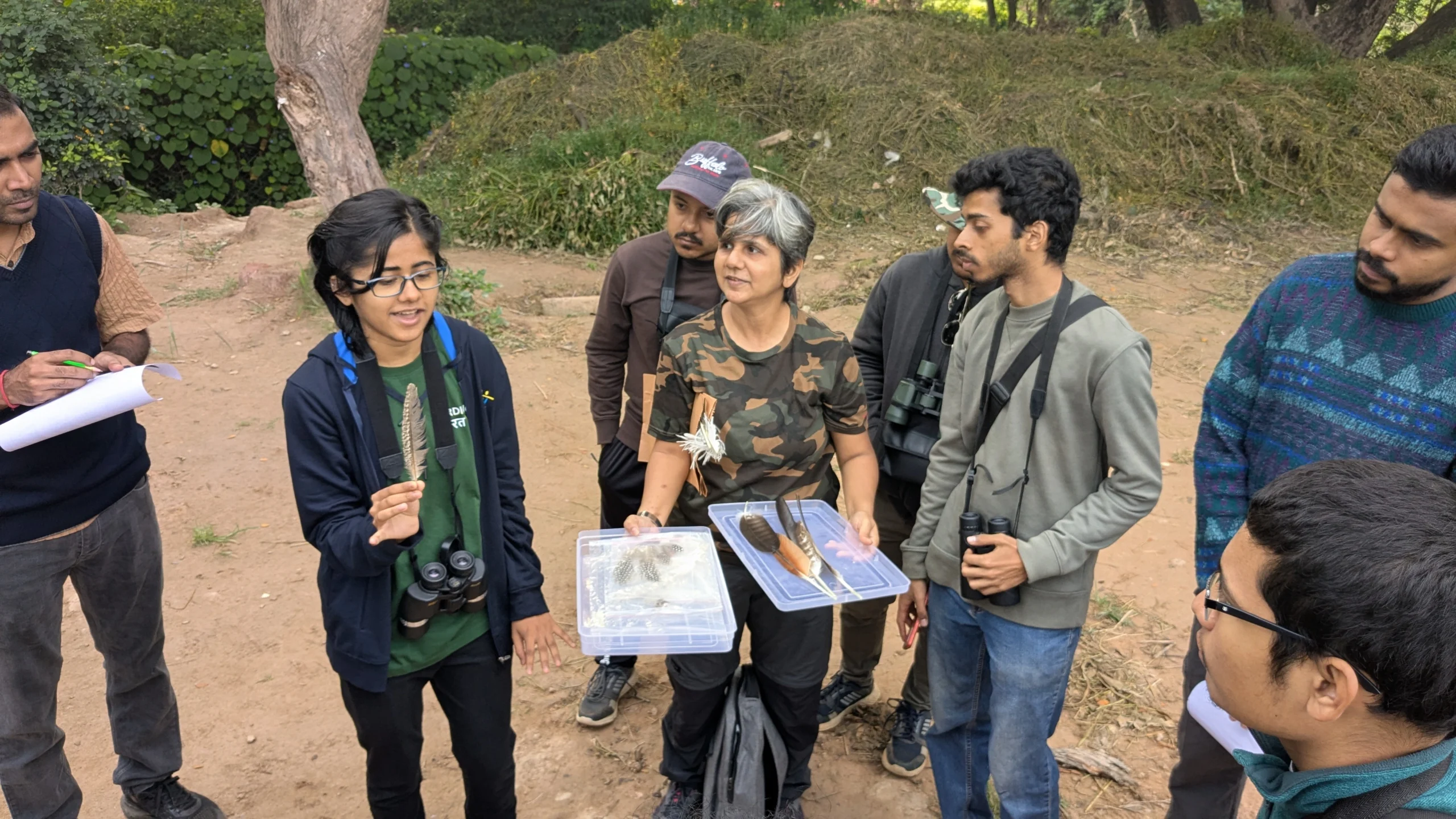The Doddenakundi Kere Bird Walk in Bengaluru, led by Manasvi and her parents, attracted 21 participants for a lively and informative morning session. The event coincided with Dr. Salim Ali’s birthday/National Bird Day, and the guide shared insights about the legendary ornithologist’s contributions and the importance of birds in maintaining ecological balance. The session included a hands-on demonstration using feathers from a peafowl, where participants learned to distinguish between tail, flight, and contour feathers, making the experience both educational and interactive.